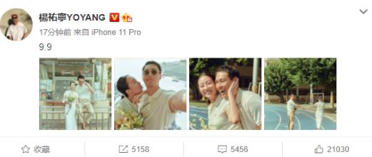 9月9日,杨祐宁发文“9.9”并分享了和妻子Melinda的甜蜜合影,两人戴着婚戒,他还捧着老婆孕肚,幸福甜蜜极了!杨祐宁工作室也转发写道:“长长久久是你,你是长长久久”。