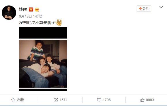 9月13日下午,微博上,谢霆锋晒童年旧照,并对小时候圆滚滚的自己非常满意,称:“没有胖过不算是厨子”。他还得意洋洋地在这句话后面配上了一个“爱你”的表情手势,隔着屏幕,粉丝们都能感受到他那拽拽酷酷的样子。