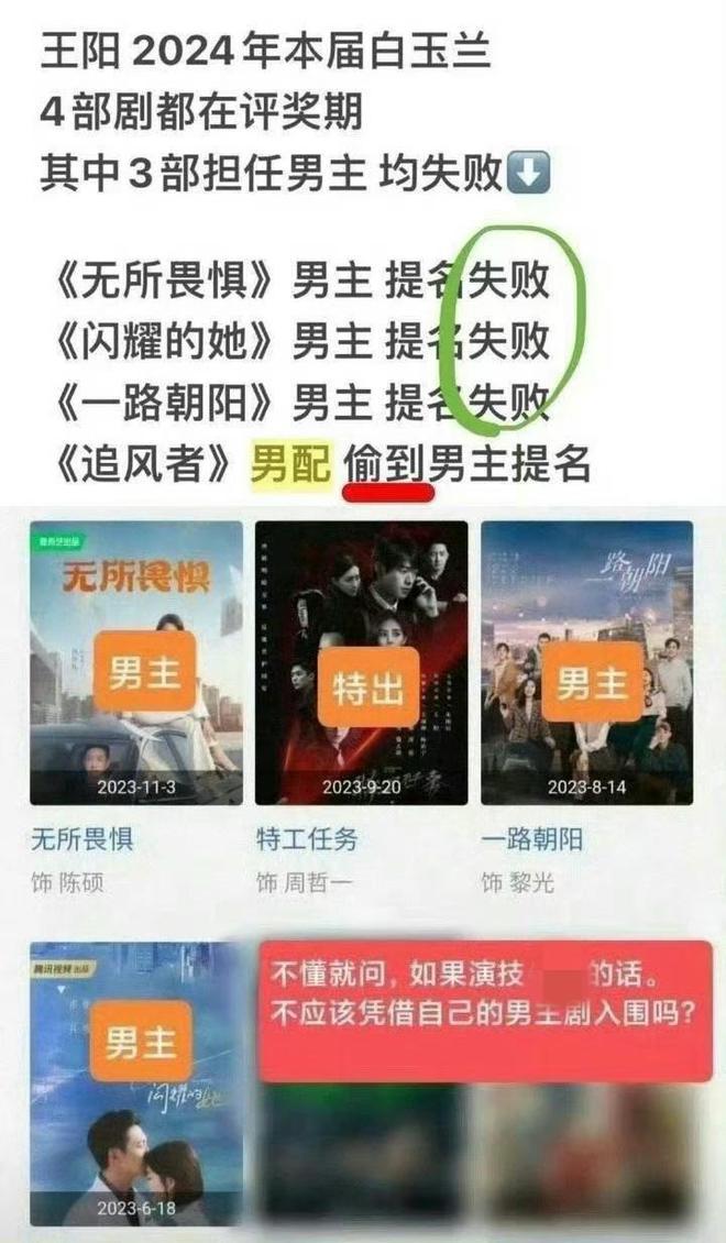 王阳在其中三部剧中都担任男一号,可三部提名全部失败,最后一部提名成功,却是 " 踩 " 着王一博上位,嘲讽性直接拉满。
