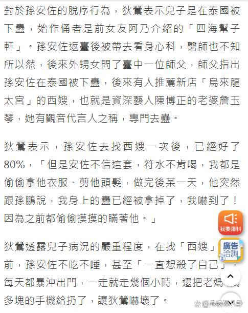 孙安佐被送入精神病院,称是在泰国被人下蛊导致精神错乱