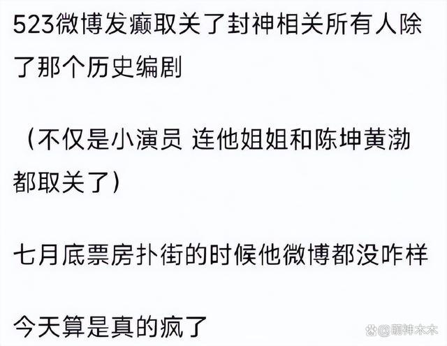 与此同时,乌尔善清空微博关注也引发争议。一开始,乌尔善取关了《封神》所有演员,只保留了一个历史编剧。接着把陈坤黄渤等人也取关了。然后 " 想取关一个人但是又怕太明显 " 话题上了热搜,网友纷纷认为是乌尔善想取关陈牧驰,但为了掩人耳目就把所有人取关。