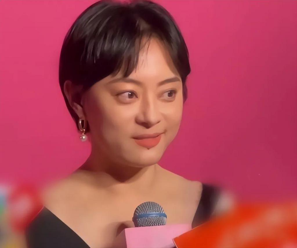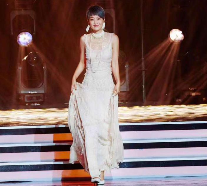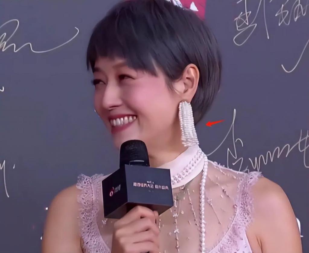 蓝灰色短发配粉色网纱礼服,里面还戴个绿色项链,除了马伊琍还真没有别人能干出这事。