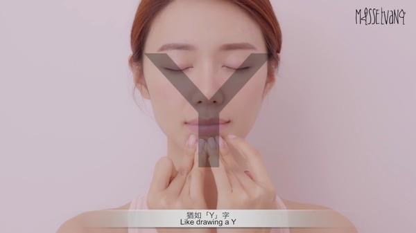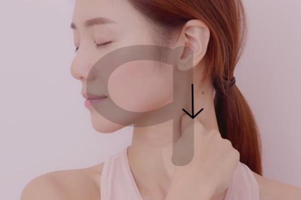 先用食指和中指的指骨在脸颊位置轻按,接着绕过嘴唇到达下巴中间,再以令一边的手按到腮骨位子,最后按到颈部(两边的做法一样)。