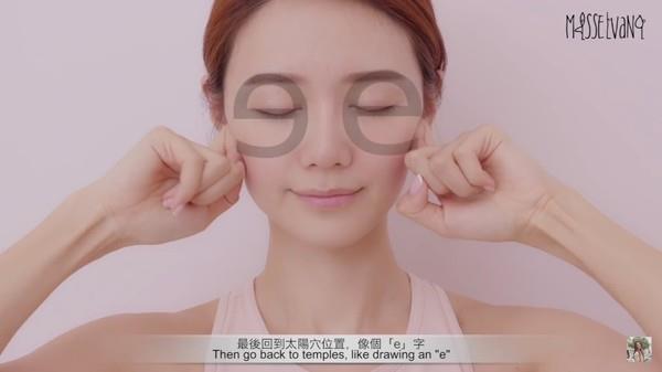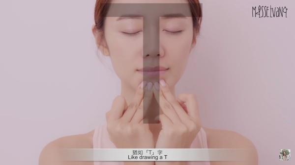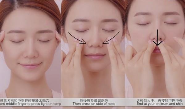 运用无名指和中指,从两边眉头按到眉尾的位置,接着再从鼻梁开始向下方轻按至人中,最后按到下巴中央。