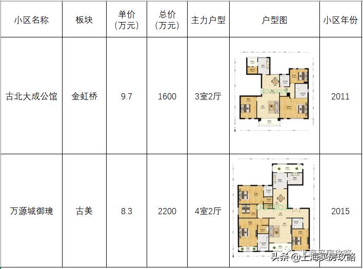 古美板块中心的万源城社区比较高端,以次新平层为主,单价在8.5万左右,两房总价在700-800万,三房总价在900-1200万左右。