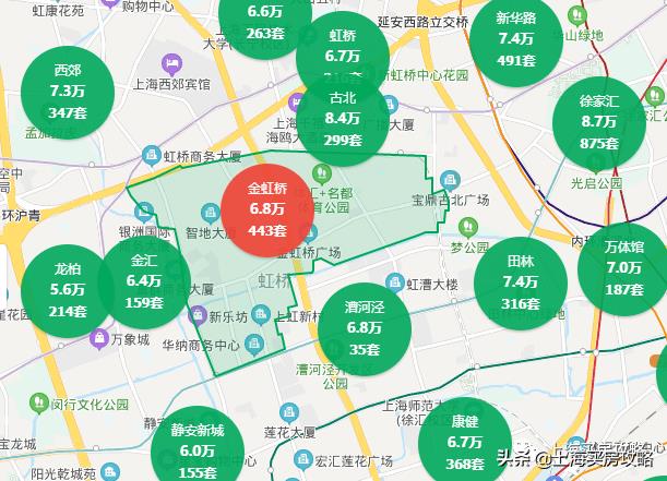 闵行区唯一的中环内区域就在金虹桥,基本与长宁古北融为一体,新建住宅基本都是豪宅定位,次新房如翡翠名都、古北大成公馆单价达到10万,三房总价在1500万以上。
