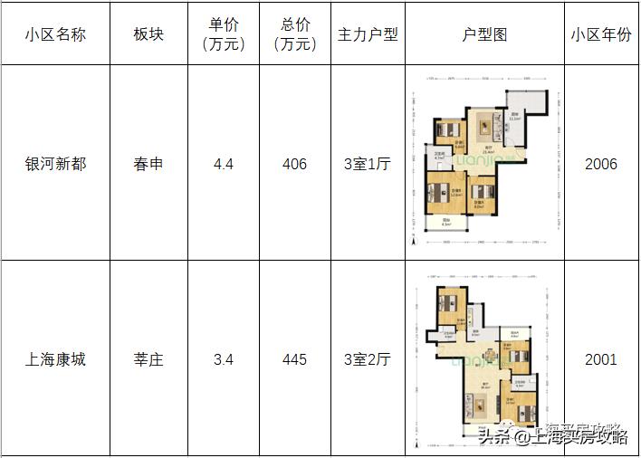 这个总价段的房源还有一部分是在金汇和华漕,虽然地理位置更好,但由于没有优质学区,单价和总价与其他区域学区房相仿。