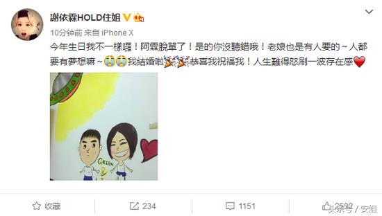 今天早上,谢依霖在网上发文宣布自己结婚的消息:“今年生日我不一样喽!阿霖脱单了!是的你没听错哦!老娘也是有人要的~人都要有梦想嘛~我结婚啦!恭喜我祝福我!人生难得怒刷一波存在感”。