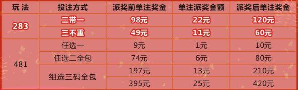 本次派奖有481玩法中的“任二全包”、“组选三码全包”、“任选一”;也有283玩法中的“二带一”和“三不重”,以上5种投注方式参与派奖,最高加奖幅度达22.45%。