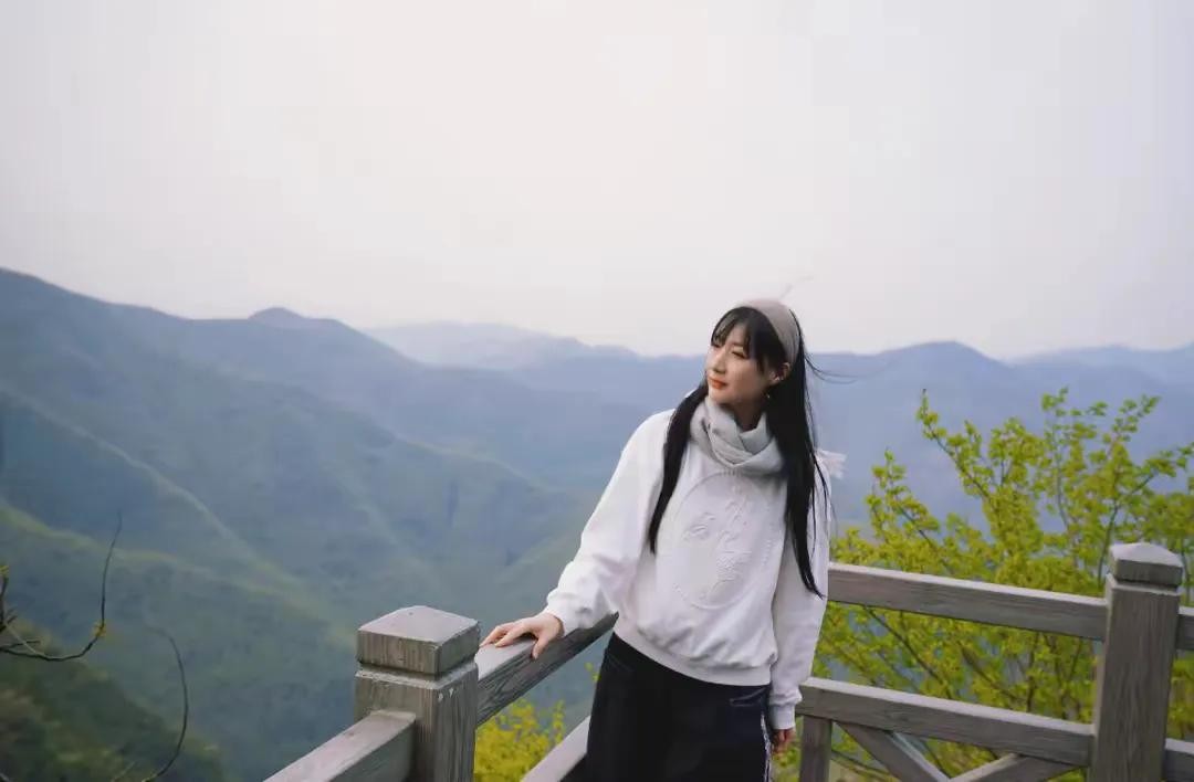 她很会拍照,在拍照过程中,也很会摆造型,看她在山上的照片,白色卫衣搭配黑色裤子,一身休闲装造型,远远看上去像不像一位年轻的大学生!