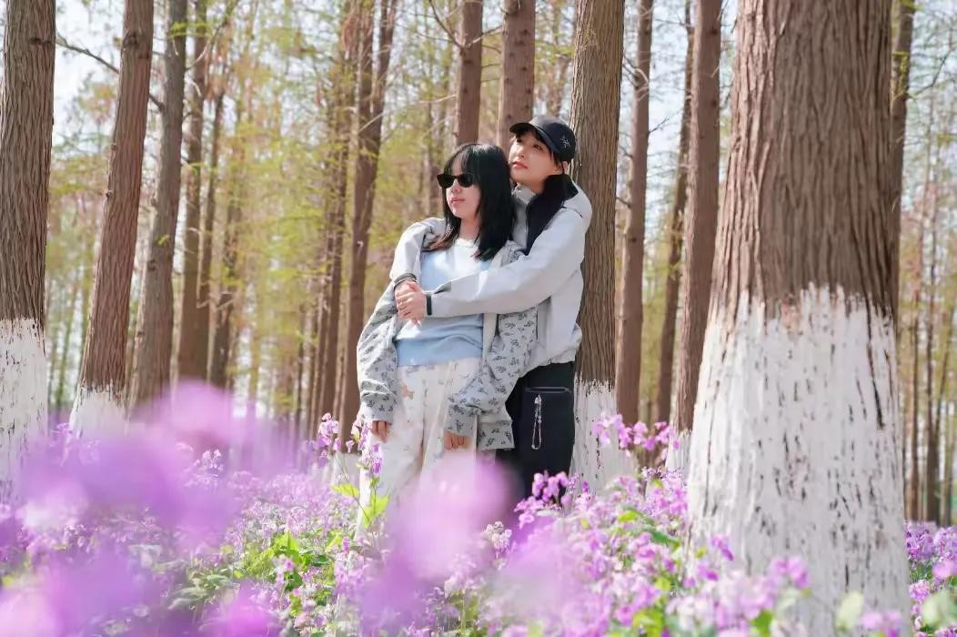 照片中翟煦飞和女儿雷小北同框画面,温馨又亲切,母女二人犹如一对姐妹花一样,站在大自然的树林中,身边开满了鲜艳的花朵,她站在女儿身后,搂着女儿的肩膀,自然又美丽!