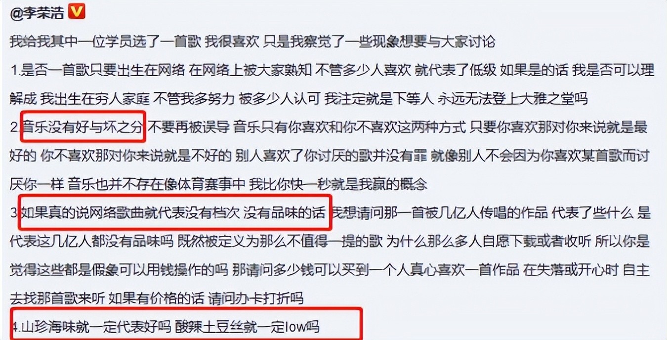 而李荣浩给出的回应则是“流行与音乐更重要”。