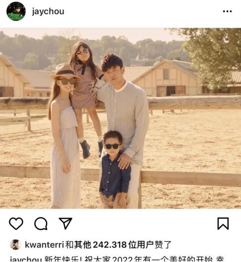 周杰伦和昆凌在社交媒体上晒出了同一张家庭照,照片上一家四口,幸福美满。