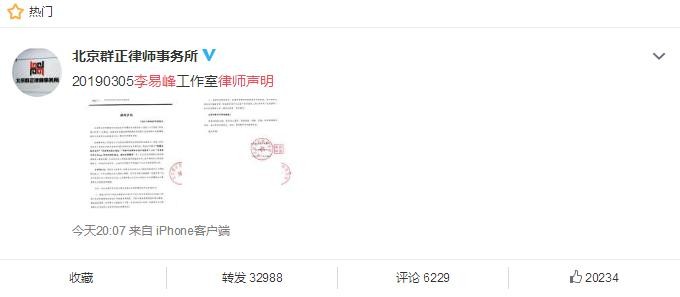 紧接着,李易峰工作室就委托律师所,就“杨幂出轨李易峰““李易峰杨幂已领证“以及“李易峰与网红湾湾恋情“等发布声明,表示上述不实内容已属严重诽谤,涉嫌构成对李易峰名誉权的侵犯,若再有相关言论出现,将以法律手段严惩。
