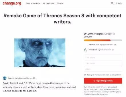 一位名叫迪伦·D的粉丝在Change.org网站上发起了一个请愿,要求HBO重新制作整季。请愿活动名为“聘请有能力的编剧,重拍权游第8季”,截至发稿时,已有超过109.2万人签名支持。