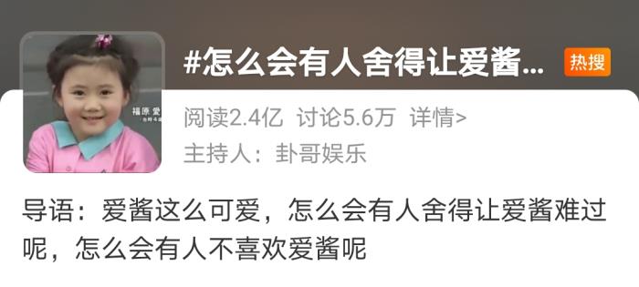 日本网友言语苛刻,中国网友则像娘家人一样支持小爱,甚至在微博热搜上出现了一个话题#怎么会有人舍得让爱酱难过#。