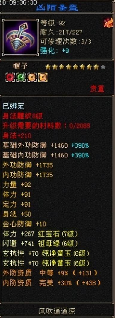 深蓝大八星帽子,身法雕纹8级,双防,力量,体力,定力,身法和会心防御。在那个身法流还没有很受重视的年代,大A选择的是双排玄抗。