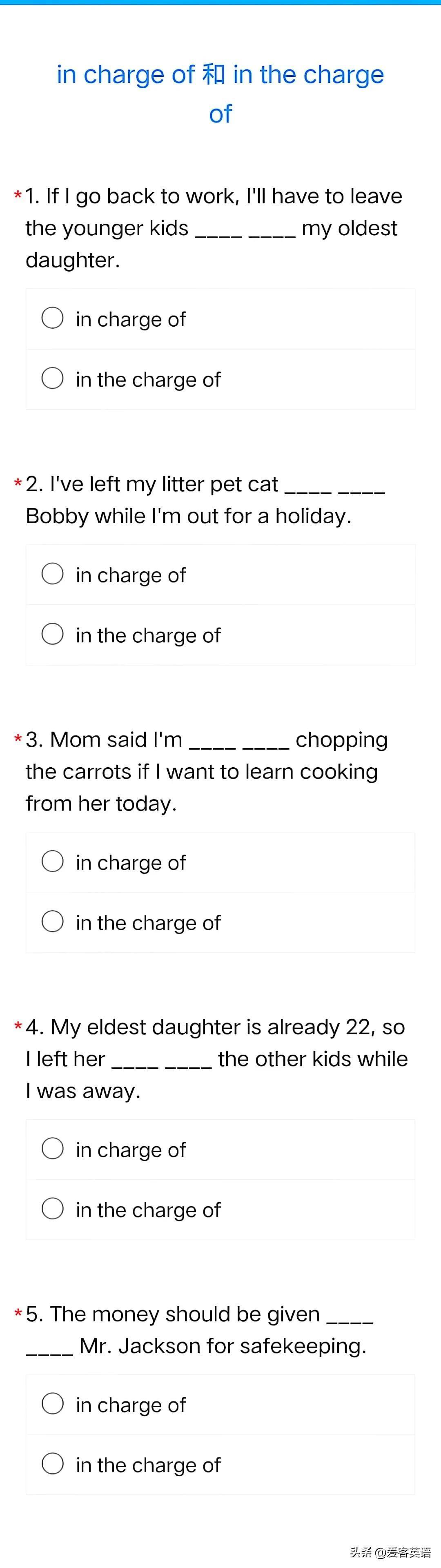 英语辨析 3:in charge of 和 in the charge of