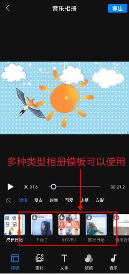 2、在弹出的界面选择合适的图片素材进行导入,导入之后发现这里内置了很多的音乐相册模板,浪漫、复古、时尚的都有,我们选择一款适合照片风格的即可。