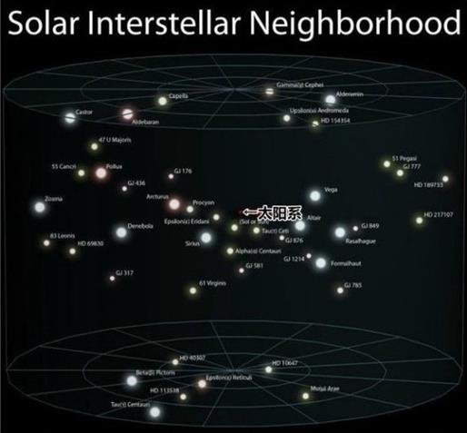 再扩大,太阳系以外,这是我们的银河系,红点是太阳系…