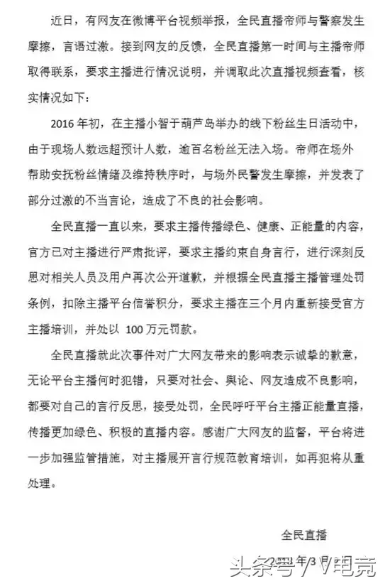 上面是微博的截图,可以看到帝师直接被点名批评,让很多人为他捏了一把汗。接着,全民直播又出了声明,对帝师进行处罚。不仅罚款了100万,还要进行各种教育培训。有网友不禁感叹到,难道帝师也凉了?