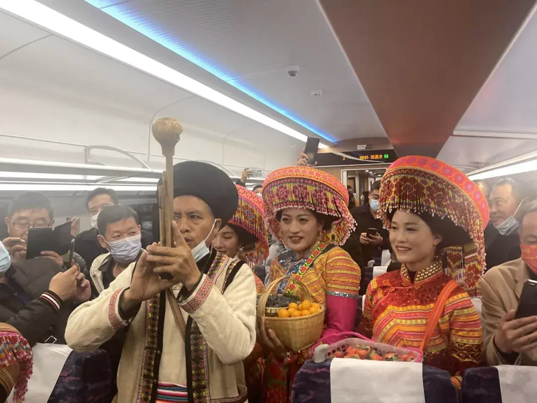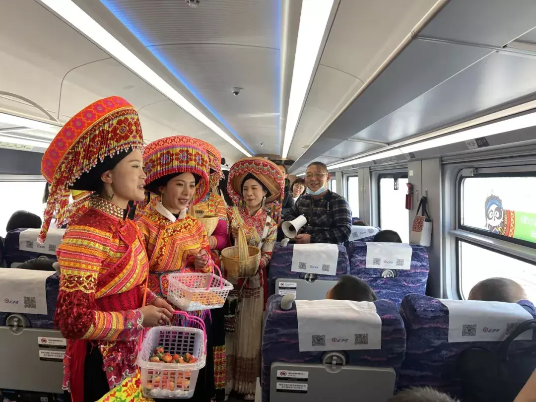傈僳族表演队伍登场,一同登场动车的还有当地特产,用甜蜜味道让此次旅途变得有滋有味。