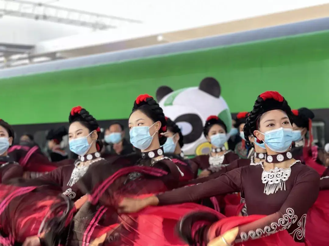 凉山州歌舞团演出人员亦是身着盛装而来,在阵阵掌声中给乘客带来不一样的旅行体验。