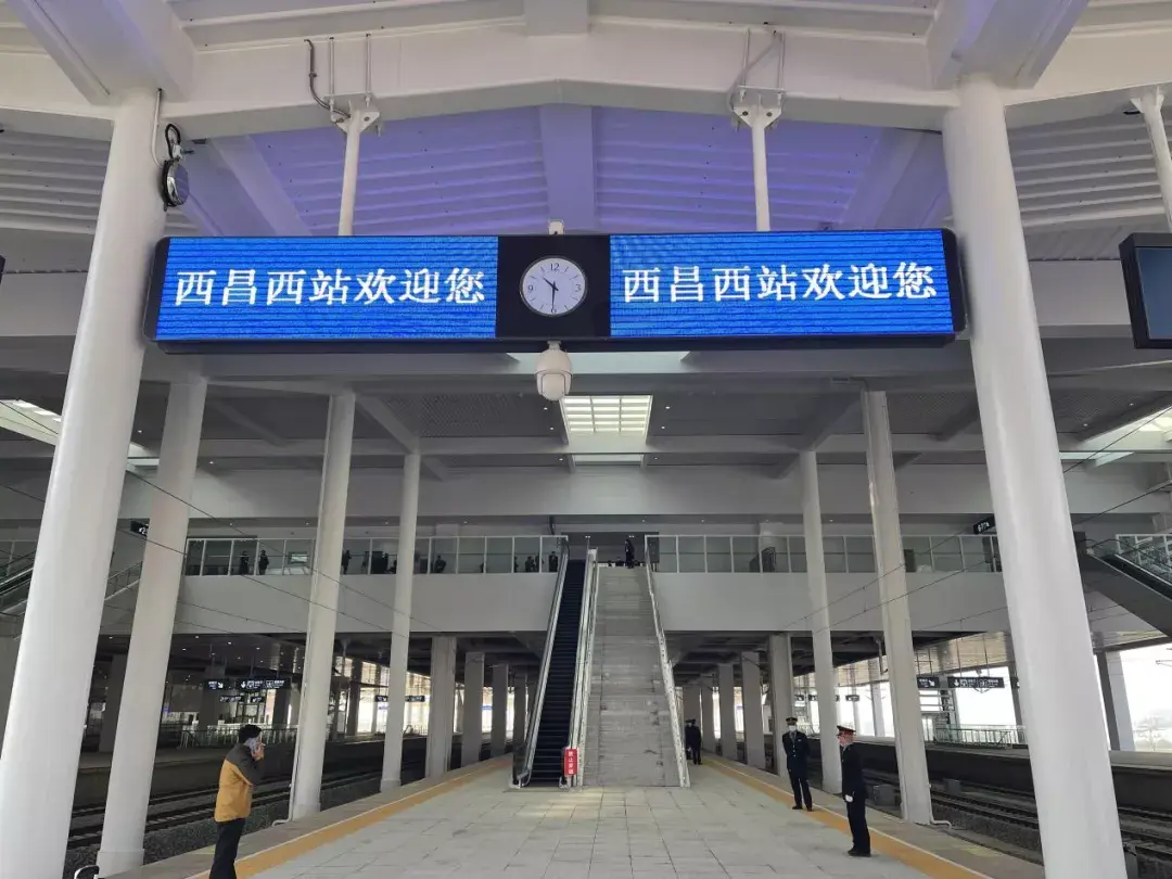 带着期待的心情,记者走进了西昌西站,揭开西昌西站神秘的面纱。西昌西站在规划设计中延续了城市文脉肌理,总建筑面积约3.9万平方米,站场规模为4台10线,为3层框架结构高架站。大厅设置了8个闸机口,共有2014个候车座椅、580个茶几,其中有84个爱心专座。此外,大厅还设置了军人候车区、重点旅客候车区、母婴室并配备服务台、无障碍电梯、餐饮区、商超区、饮水区、吸烟室等,整个大厅可容纳2500名左右的旅客。