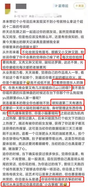 有一位老粉发表了一篇长文,对霍尊进行了全面的批判。在这位前粉丝口中,霍尊无论是外形还是业务能力,都不行。