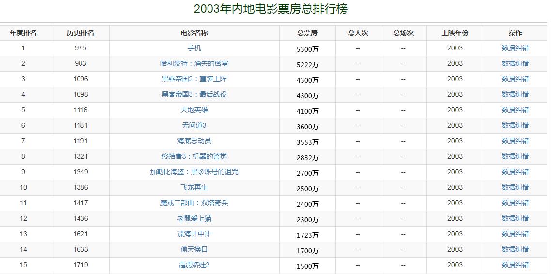 2003年,中国内地电影市场总票房收入是10亿。票房冠军是冯小刚执导、由葛优、范冰冰等主演的一部贺岁喜剧片《手机》,票房是5300万。