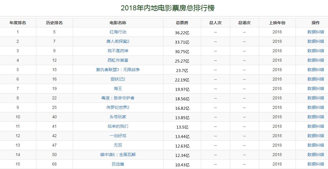 2018年,中国内地电影市场总票房收入是609.76亿。《红海行动》以36.22亿夺得年度票房冠军。