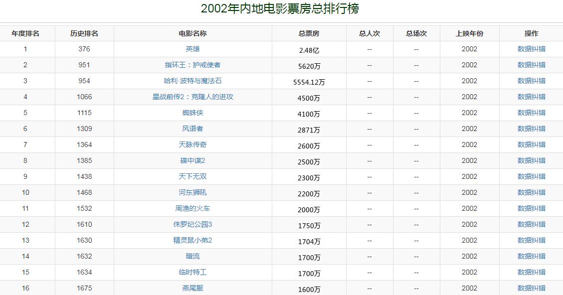 2002年,中国内地电影市场总票房收入是9亿。由张艺谋执导、李连杰、梁朝伟、张曼玉、陈道明、章子怡及甄子丹主演的武侠电影《英雄》以2.48亿票房夺得票房冠军,该片也开创中国商业大片先河。