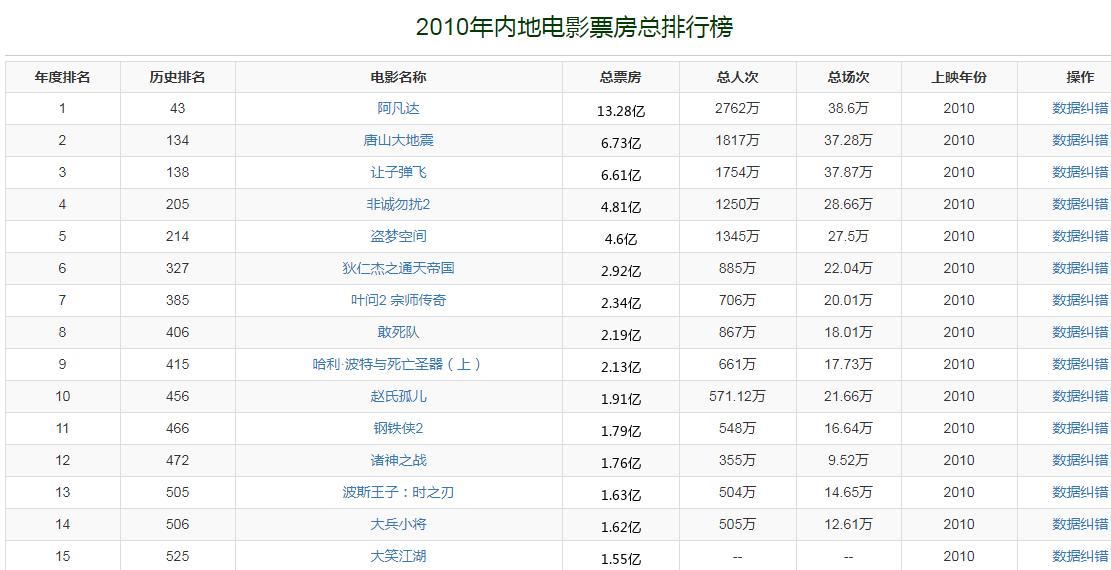 2010年,中国内地电影市场总票房收入是101.7亿,内地电影市场总票房正式踏入百亿票房大关。电影《阿凡达》以13.28亿夺得票房冠军,该片也是在内地电影市场首部破10亿的影片。