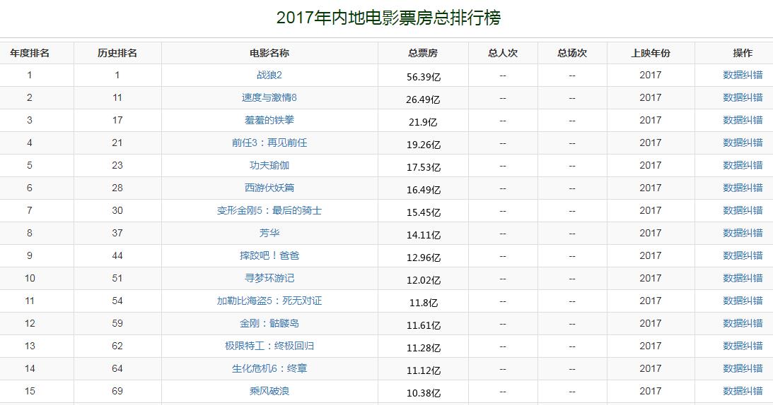 2017年,中国内地电影市场总票房收入是559亿,吴京自导自演的《战狼2》以56.39亿不但成为年度票房冠军,同时也成为新的内地电影市场历史票房冠军,这个纪录一直保持至今。