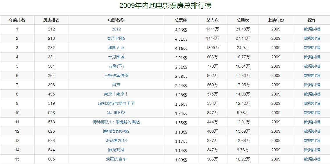 2009年,中国内地电影市场总票房收入是63亿。由罗兰·艾默里奇执导的好莱坞大片《2012》以4.66亿获得票房冠军,该片也一举打破了1998年《泰坦尼克号》创下的3.6亿票房纪录。