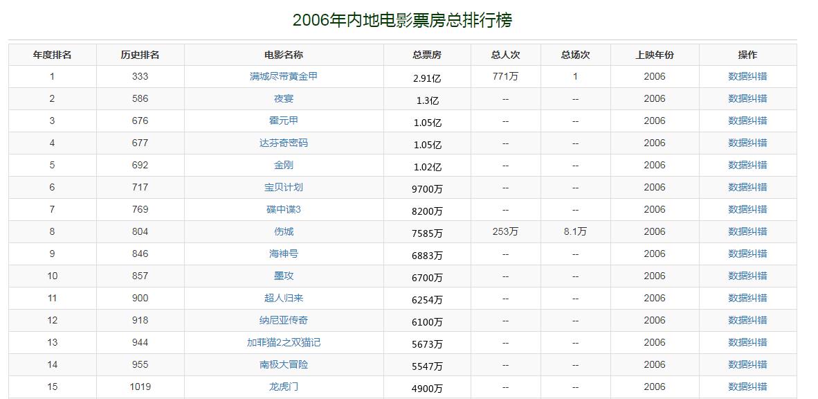 2006年,中国内地电影市场总票房收入是26亿。张艺谋执导、周润发和巩俐主演的《满城尽带黄金甲》以2.91亿夺得票房冠军。