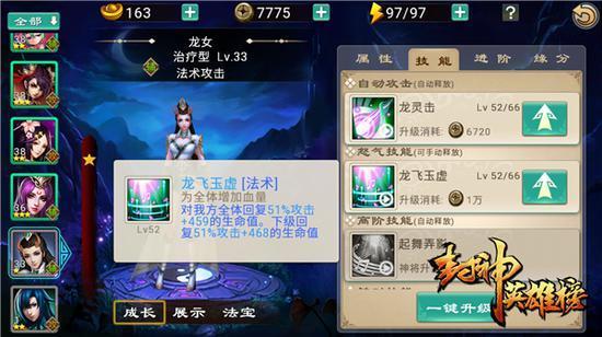 3、高阶技能:神幡飞舞,法术攻击,CD三回合,攻击对位并溅射周围单位,有小概率眩晕敌人,持续一回合,等级越高概率越大。