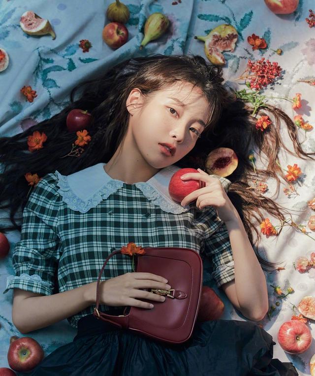 IU散着长发躺在地上,满满的清新气息,这不就是迪士尼的在逃公主吗?搭配一个酒红色腋下包,搭配黑色百褶裙,文艺气息十足,喜欢这种风格的女生就可以跟着IU这样穿,森系范十足。