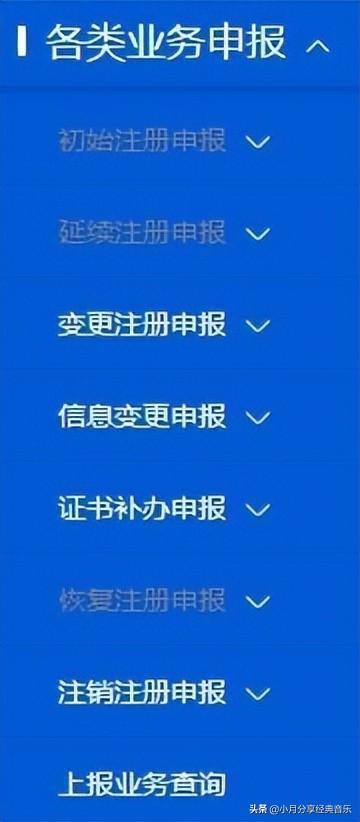登录系统后,点击左侧菜单“各类业务申报”,展开操作列表如下图所示: