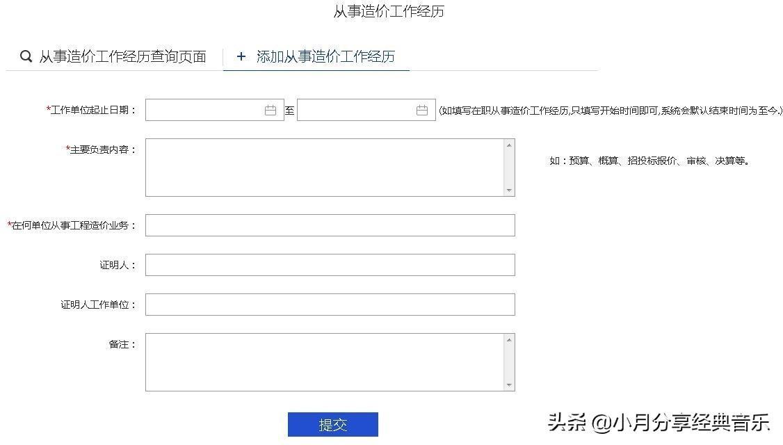 点击“添加从事造价工作经历”,可添加本人从事造价业务的工作经历,点击“提交”按钮。