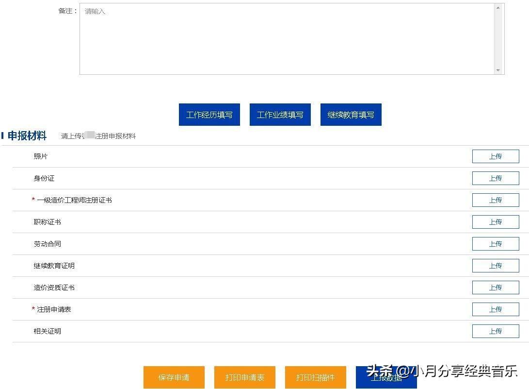 填写相关信息,保存申请。工作经历填写、业绩工作、继续教育填写,填写完成后保存申请。(参考初始注册)上传扫描件(操作流程参见“初始注册”的说明)。保存申请,打印申请表,将打印的申请表盖章后,上传至系统,并再次保存申请。信息填写无误,扫描件都上传完成后,可以上报数据。住建部审批通过返回审批结果后,延续注册业务完成。