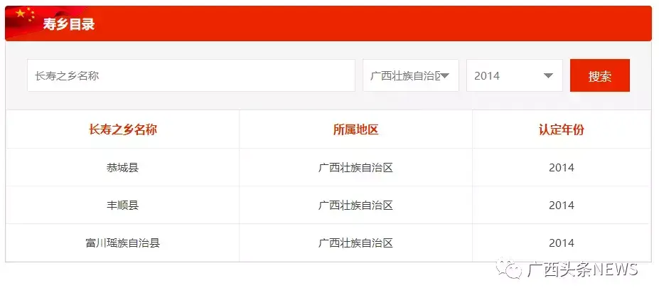 图为官网截图。广西2014年获评“中国长寿之乡”名单。