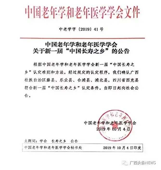 10月5日,中国老年学和老年医学学会在其官网上公布了新一届“中国长寿之乡”名单,此次全国共有5县获评,广西藤县、乐业县、合浦县和浦北县名列其中。至此,广西已有29个县(区)拥有“中国长寿之乡”称号!
