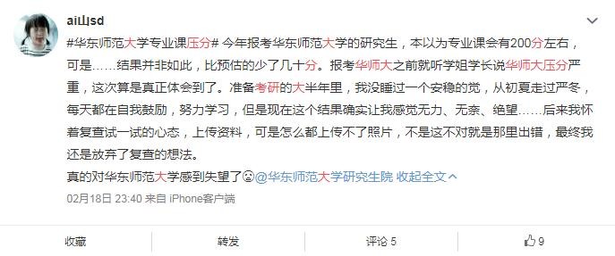 微博上也有多位网友发帖称,华师大考研专业课压分,一网友称自己专业课比预估的少了几十分,且这位网友表示,“报考华师大之前就听学姐学长说华师大压分严重,这次算是真正体会到了”。