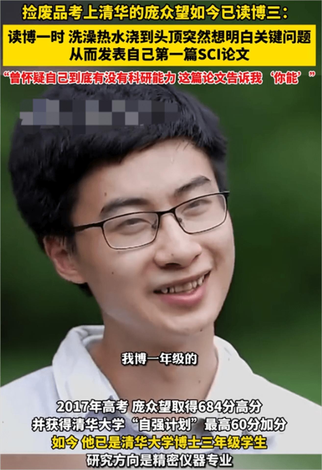 再次进入大众的视野,此时的庞众望已经是清华大学机密仪器21级博士生,正在从事网络相关的研究。