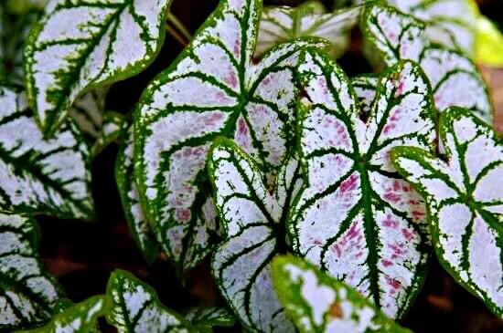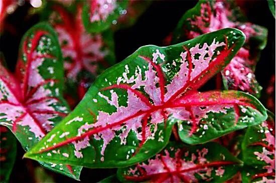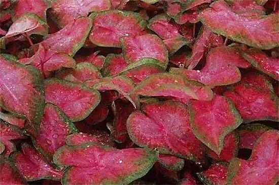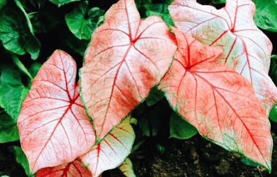血心五彩芋·是较为优良的品种。叶片中心为玫瑰红色,边缘是白色的,叶面有绿色斑点。是较为优良的品种。