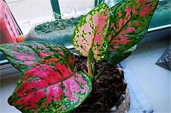 叶片较大,粉红色夹杂绿色斑纹,叶脉为红色。细心养护叶片会越来越有光泽。
