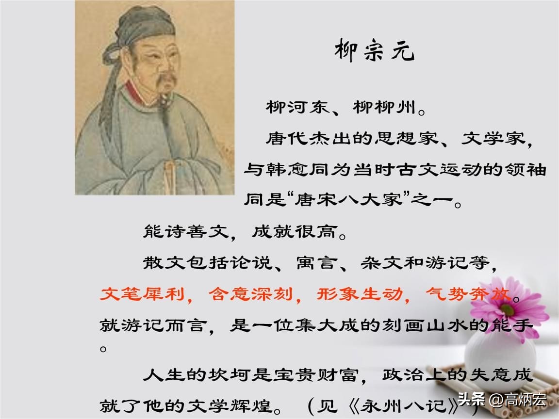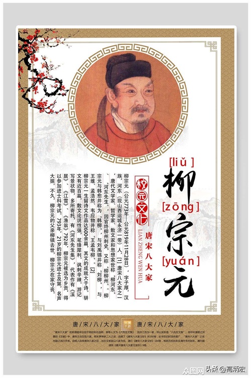 柳宗元,字子厚,世称“柳河东”。他与韩愈齐名,共同推动了古文运动的发展。柳宗元的散文风格多样,既有犀利深刻的政论,也有清新优美的山水游记。他的《永州八记》,以细腻的笔触描绘了永州的自然风光,同时也寄托了自己被贬后的忧愤与无奈。