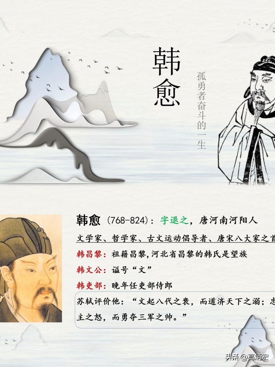 韩愈,字退之,自称“郡望昌黎”,世称“韩昌黎”。他是唐代古文运动的倡导者,主张“文以载道”,强调文章要有思想内涵,要为社会服务。他的文章气势磅礴,逻辑严密,语言简练而有力。例如他的《师说》,通过对从师学习道理的阐述,批判了当时士大夫耻于从师的不良风气,倡导了一种积极向学的精神。