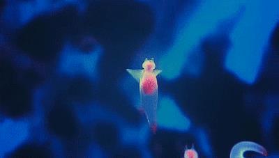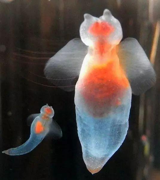 去日本旅游过的朋友对这个"海天使"一定并不陌生,因为它除了生活在南北两极的极寒海域下外,我们还经常在日本的北海道海域附近发现它们的踪迹,而在日本的水族馆等地都有展示可供观赏的裸海蝶。它们的身长只有3公分左右,还不足一个人手指头的长度,就算是发现的最大个体也不过10公分左右。在晶莹剔透的外表下,我们可以看见它身体内部的组织,位于身体上半部分的橙红色部位是它的生殖和消化器官,同样也是它心脏的所在位置,这鲜艳的部分与它透明的外表相得益彰,看起来像是闪闪发光的萤火虫,在海洋里显得楚楚动人。但在这个美丽动人的"天使"外表下,其实还藏着它们鲜为人知的另外一面——"恶魔"。